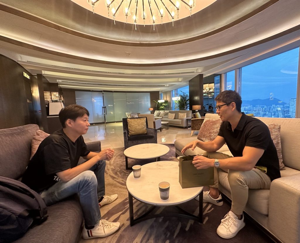 四季(Four Seasons)は香港のランドマークの1つとして知られています。ビクトリアハーバー(Victoria Harbour)の景色を一望できる場所に位置しており、夜には素晴らしい夜景を楽しむことができます。ラウンジで塾長とビジネスミーティング。