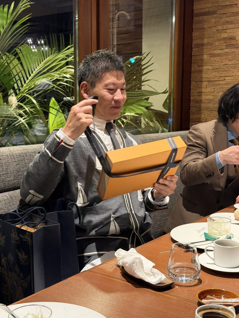 ▲ いつもお世話になっているシンヤ塾長にはルイヴィトンのマフラーをサプライズプレゼント🎁
